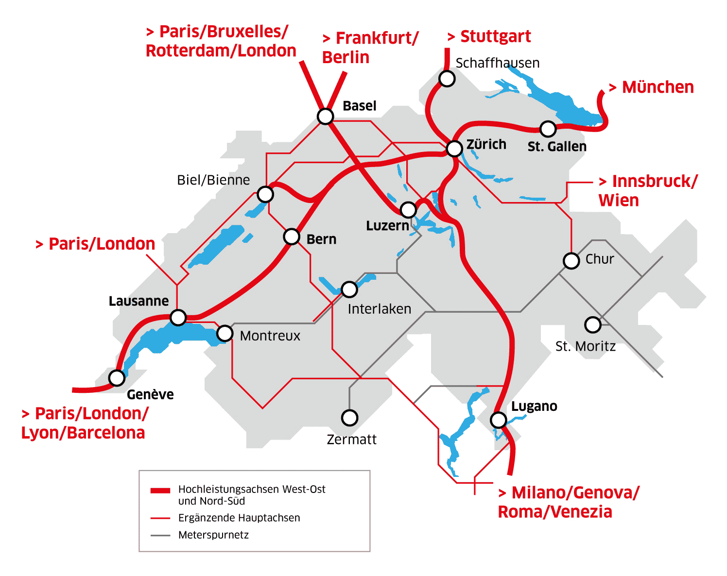Nur eine langfristige Vision – die alle bereits beschlossenen Investitionen mit einbindet – wird eine Erneuerung des schweizerischen Eisenbahnnetzes und damit eine starke Verankerung in Europa ermöglichen. Das Gerüst dieses neuen Netzes beruht auf dem Verkehrskreuz Schweiz mit den beiden Hauptachsen West-Ost und Nord-Süd von Grenze zu Grenze.